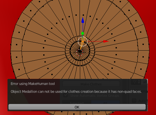 Model the medallion starting from a cylinder primitive, with the top and bottom covered by a triangle fan. When the Make Clothes button was pressed, and error was reported. The medallion mesh contains triangles, but a MakeHuman mesh must consist of quads only.