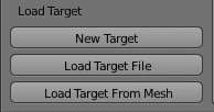 After the mesh is loaded into the scene, the MakeTarget™panel layout will change, showing three new buttons that handle setting up the morphing targets. The first button creates a new empty target which will just be the original base mesh loaded in the previous step. The second button loads the morphing from an existing target file. Do not attempt to load target files from the previous MakeHuman™versions, as these files are not compatible with the current base. The third button creates a new target from an existing base mesh that is MakeHuman™compliant (derived from the A8_v74.obj file provided with the MakeTarget™release distribution), for example, a character modelled with an external tool (Maya, Max, C4D, etc..) and then saved or exported so that it can be imported into Blender as a wavefront obj file. To correctly use the third button, it is necessary to first select the imported base, then the MakeHuman™ base, and then press the Load Target From Mesh button. When the steps have been done correctly and that button is pressed the imported base will disappear and its transformations will be transferred onto the MakeHuman™ base.