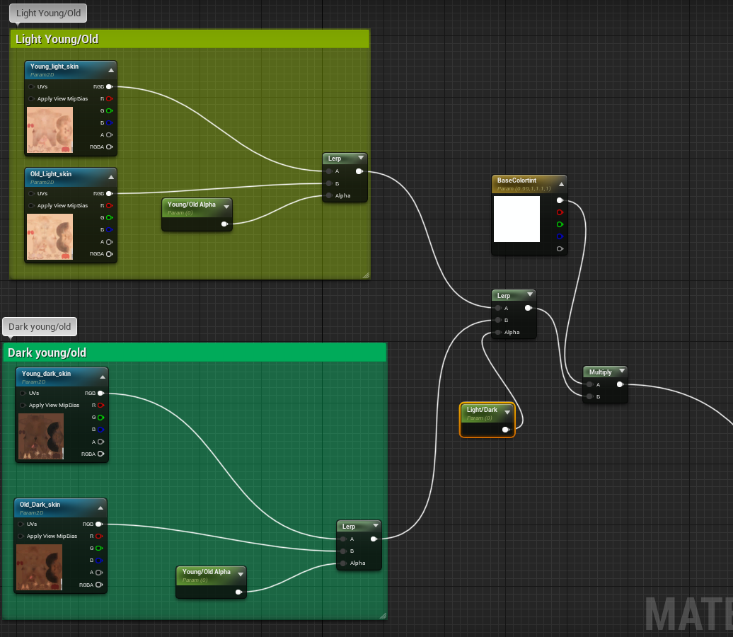 The "master material" looks like this in details - in the first part you can combine young/old+light/dark skin with age.. the textures are all from make human.