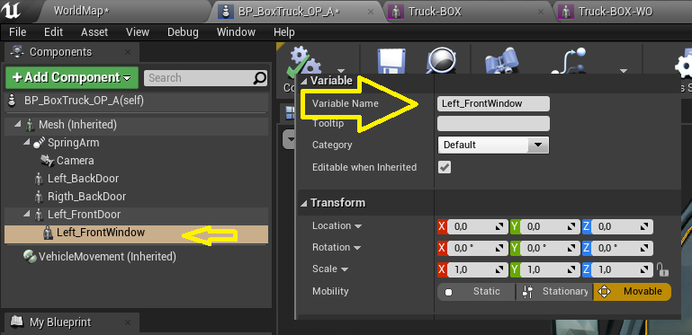 • BP_BoxTruck you make a CHILD blueprint of this and you need to add meshes etc. as shown below!