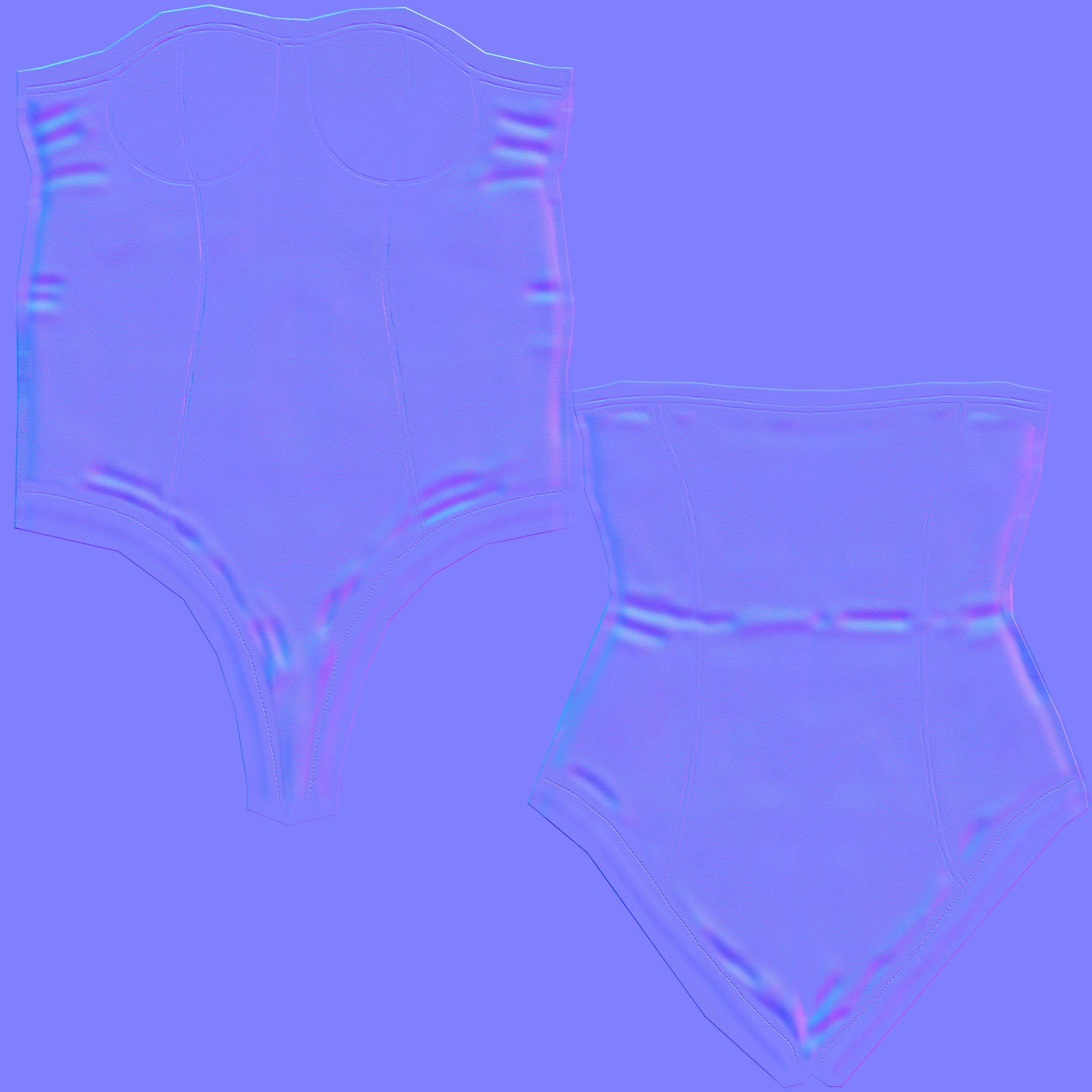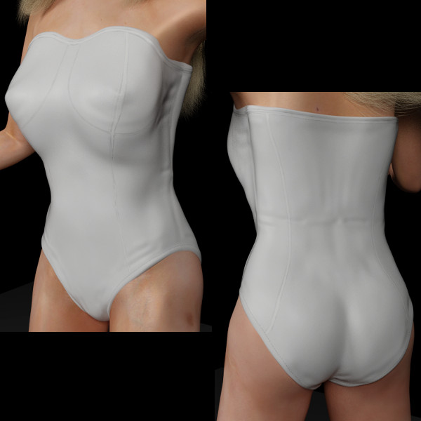 This rather simple strapless bodysuit should be used for female characters. Normally it is used as a shape-wear, but you can use it for different purposes (e.g. as part of a costume). It is designed to fit with the ballet tights. Delete groups are used and a normal map is added and made visible in makehuman using the leather litsphere.