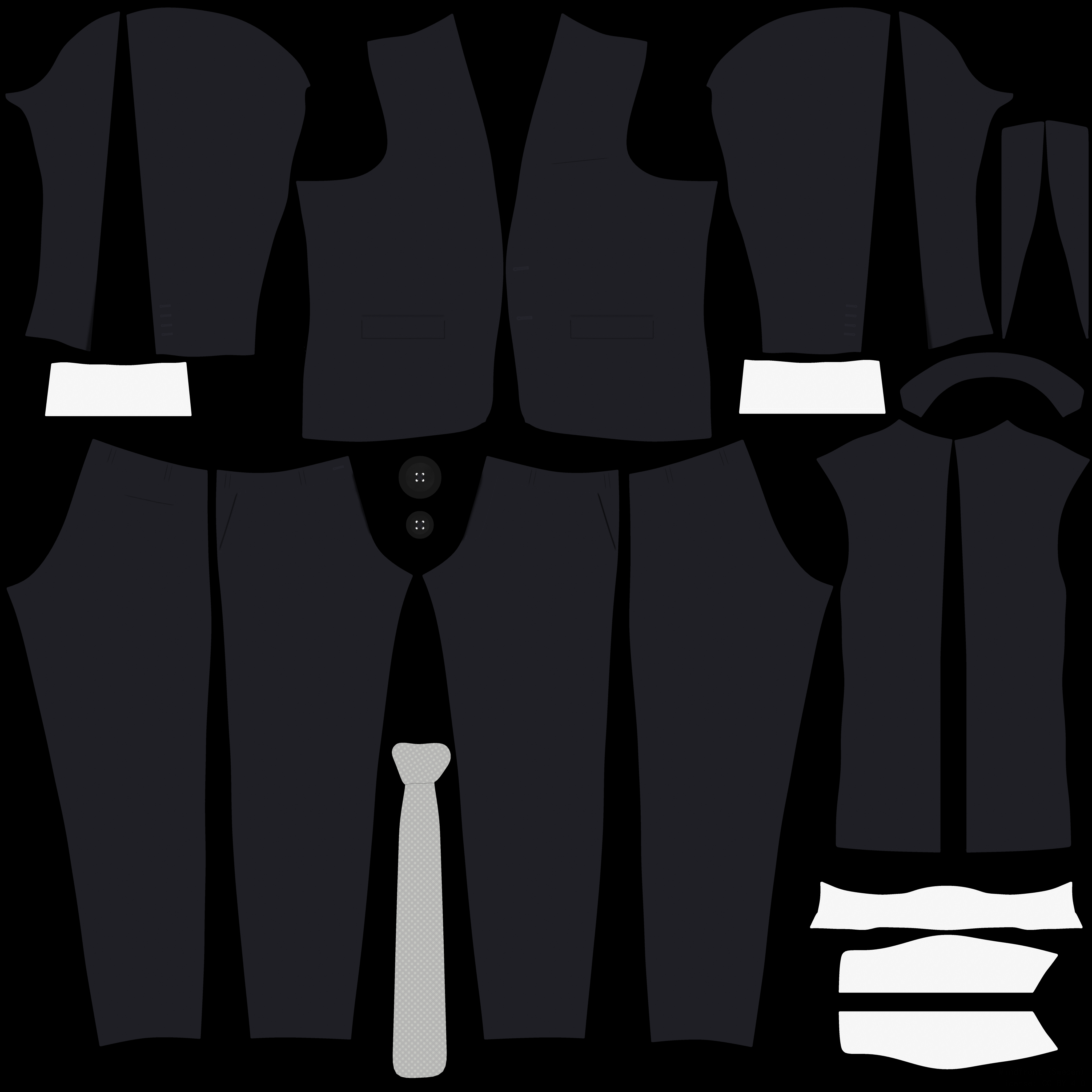 Tailored suit, but the shirt and tie are fake. The normal map do most of the other details. I made the buttons three vertex hard body but I could't get them to work in all situations without them loosing their shape and location. If the buttons are important you could get them from the OBJ-file and place them manually.