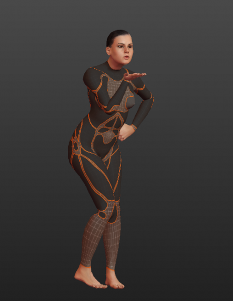 blowing a kiss. hand-hip contact works well with standard height and weight but will fail with extreme changes in height or hip size. includes subtle face pose.