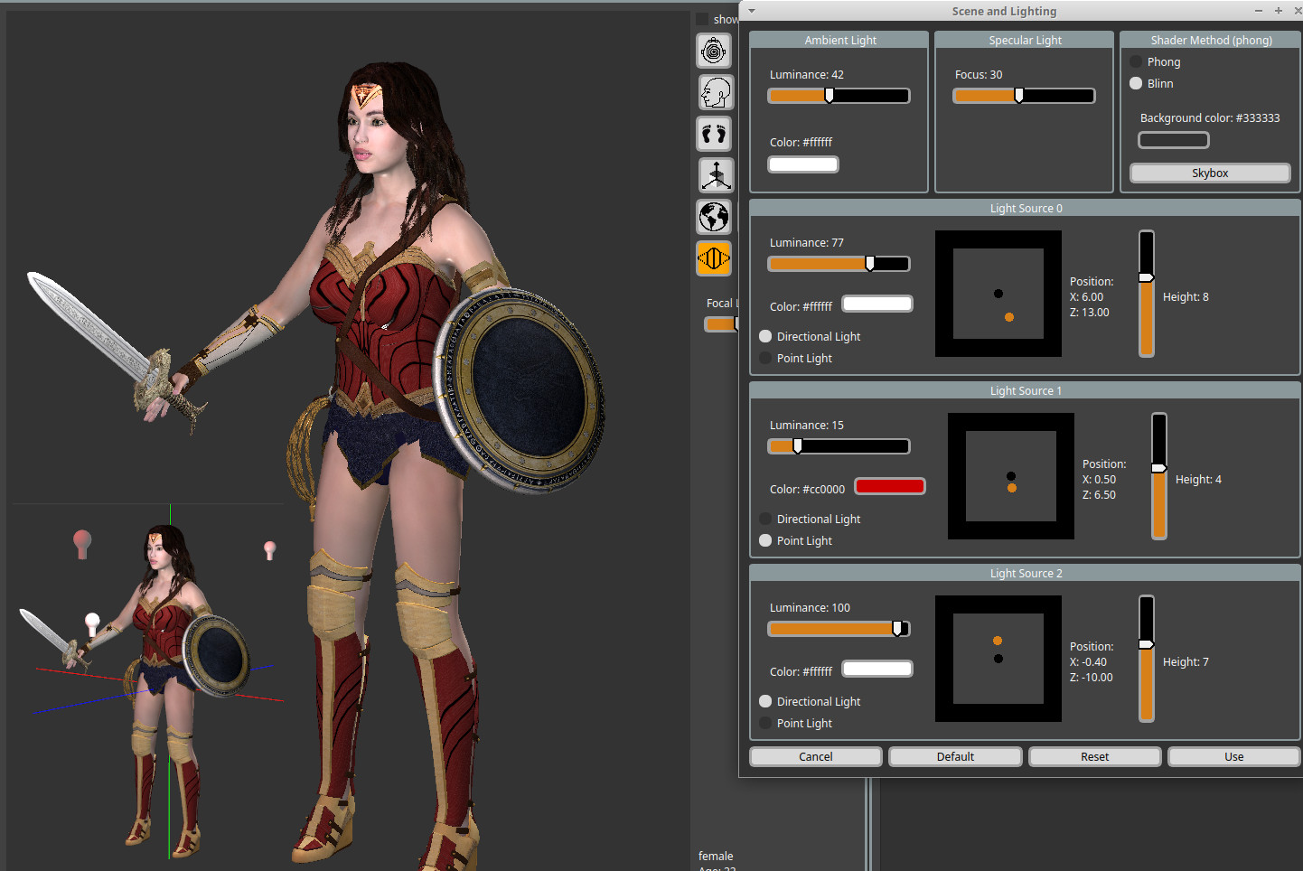 I took the old code and, more or less figured out it is a phong shader in a way and adapted it to all 3 lights I have (one can switch off 2 lights to get the same result we had before), then I took one of my test characters and changed the lights to get some artificial results. The example is shown in the image. When the character is animated it looks even better :mrgreen: