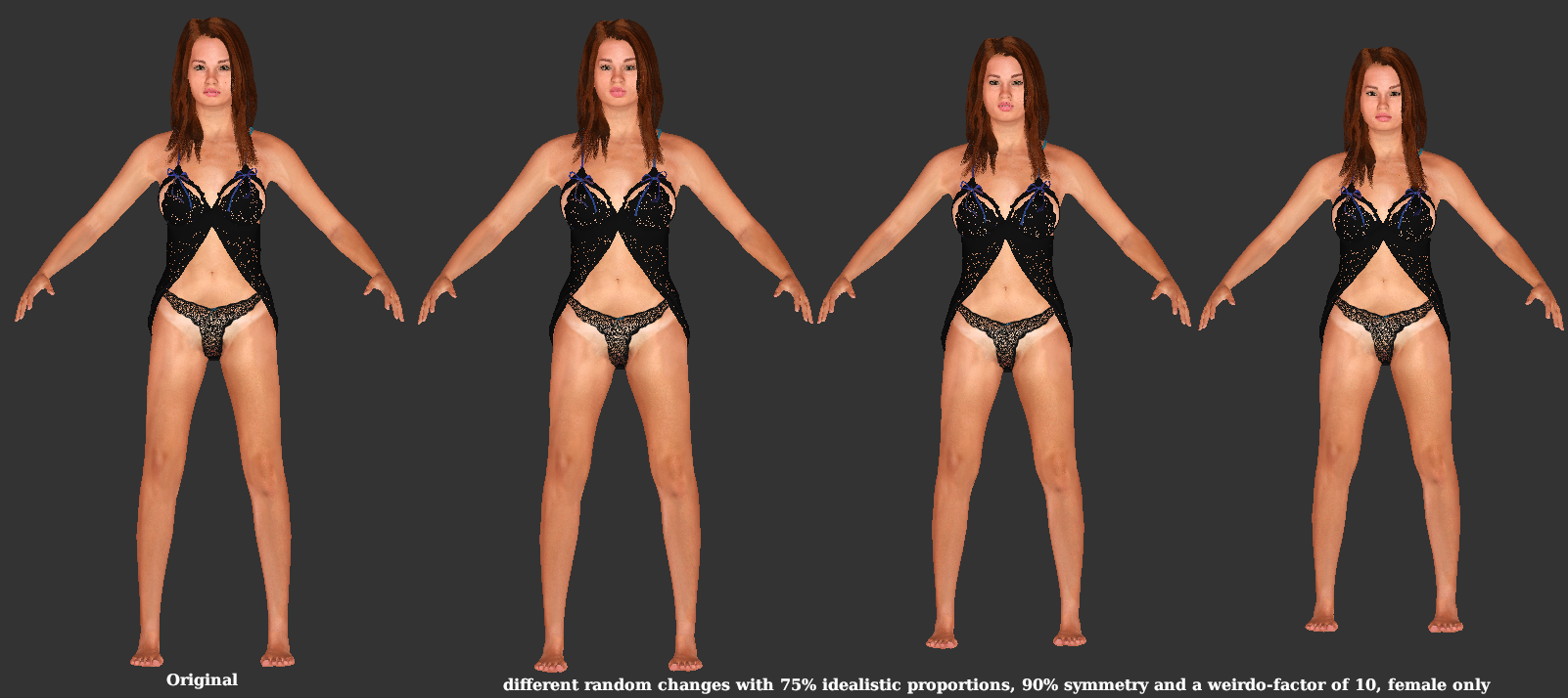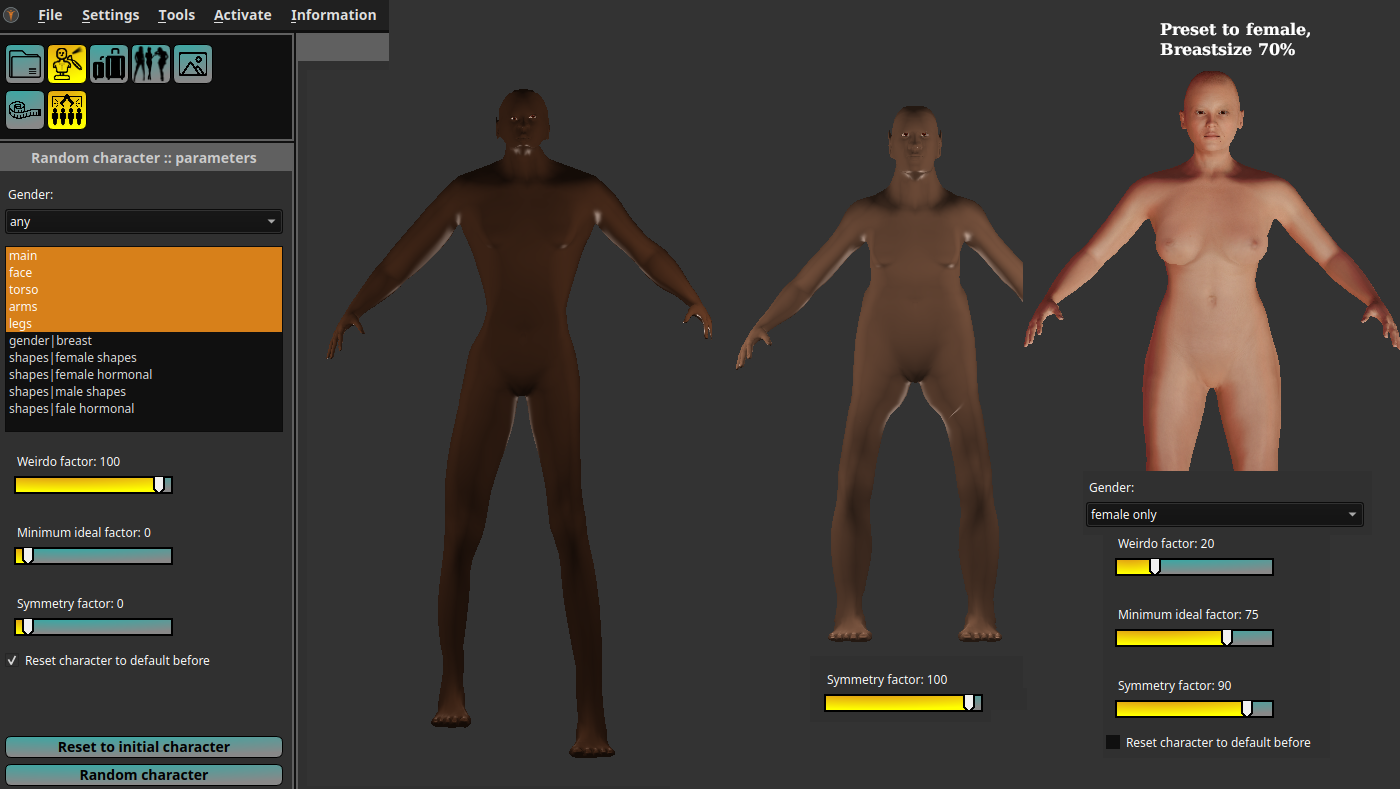 Anyway I tried with the random-generator meanwhile. One can really create creepy characters, like the one on the left side. With symmetry some look rather cute. And when I change them only a little and set ideal factor (which is proportions) to higher value + start with a character (here 100% female, breastsize= +50%), and NO reset to standard it seems to be quite okay.
