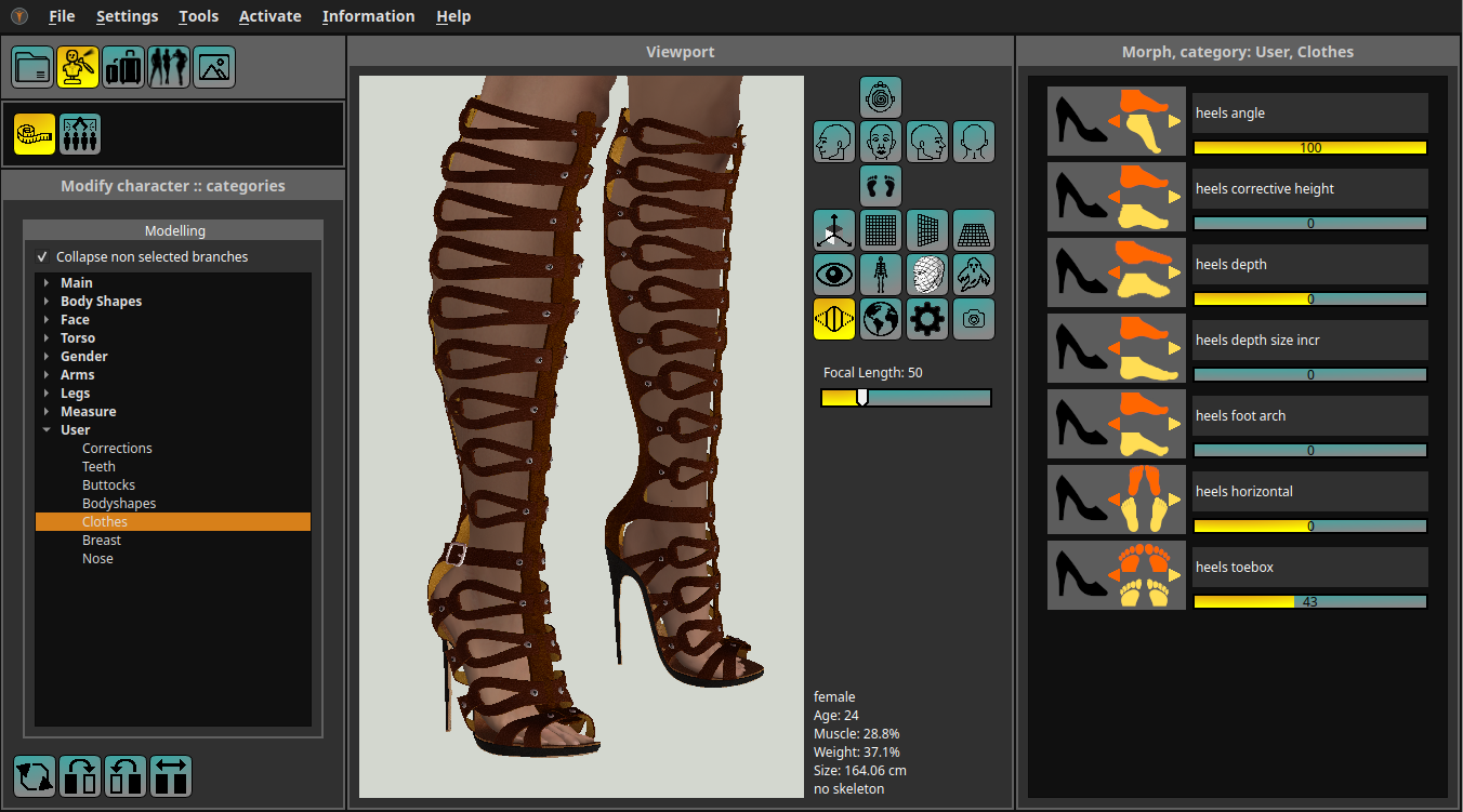 Furthermore an example of a custom folder of targets. Btw. these targets also work with old makehuman. But this way it looks more seamless and one also can add own icons + incr/decr targets also generate only one slider with a "middle position". Simply done by using correct name patterns. These own targets can also be compressed to binaries (like the internal ones) to load them very fast. The character animation of walking even work with these shoes. Unfortunately she walks a bit slow. These shoes have a lot of geometry ;)