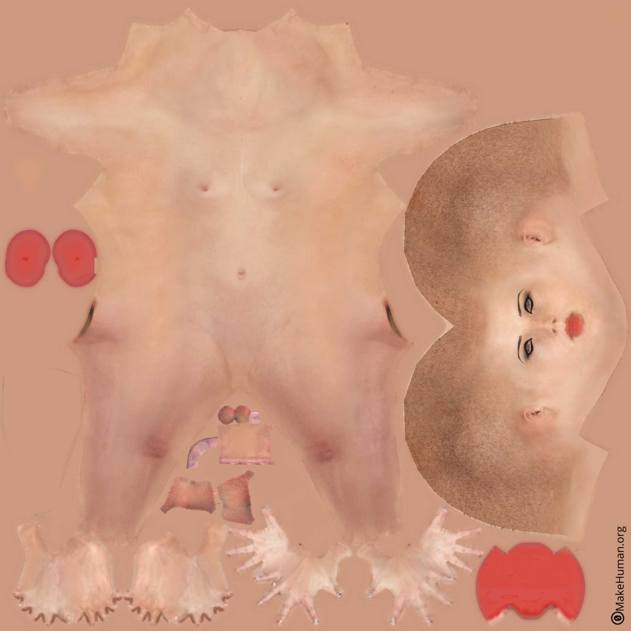 This skin is a combination Makehuman's "young caucasian female suit" face texture pasted on the "young caucasian female2" body texture, with red lipstick added. Installation instructions: Create a new folder called "darthfurby_caucasian_female" in the Makehuman skins directory located at 1.1.x/data/skins and copy all files to the new folder (.mhmat, .thumb and diffuse .png texture). Download the face morph/model here: http://www.makehumancommunity.org/model/darthfurby_pretty_female_01.html