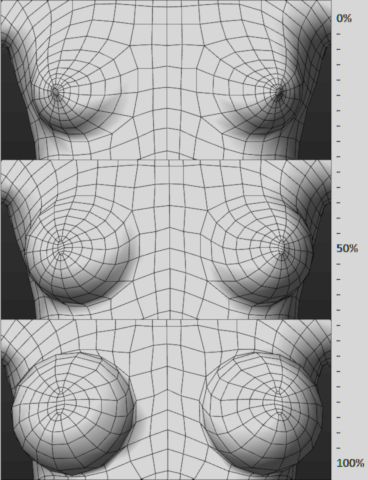 For realistic female characters, using a low % can help simulate the support of a bra under clothes. A high % forms a stylized, almost spherical shape, useful for character designs with exaggerated proportions (for games, comic books, etc), or realistic ones with intensive, ahem, augmentation.