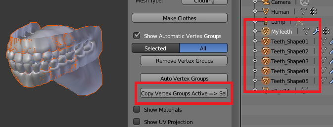 Several different teeth shapes can be selected in MakeHuman. However, all teeth meshes have the same topology. In this situation, we don't have to repeat the task of assigning vertex groups, because there is a button that copies vertex groups between meshes with the same topology.