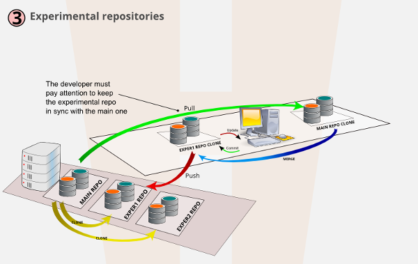 To start up a new feature yet unproven or that is unsure how to implement it exactly, or for a big refactor that might make a lot of problems until solved, we will create experimental repos, cloning the main one. One repo for (large) feature.
