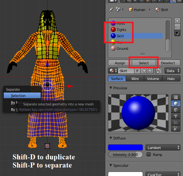 The dress now consists of a contiguous mesh, but the materials are still those of the human. Unlink the human materials and create the bluish Dress material, as we did in the first part above.